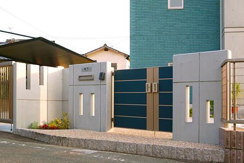 コンクリートの塀とブルーの門扉が建物との強い統一性を生み出しています。ランダムに配置したスリットでスタイリッシュモダンに仕上がりました。
