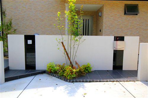 全体的にホライトカラーを基調にしたエクステリアは清潔感があり、清楚な感じを与えつつも、正面の塀を長く配置したことで存在感があるアウトテリアとなりました。自然石の黒のラインが堂々とした印象を与えてくれます。
