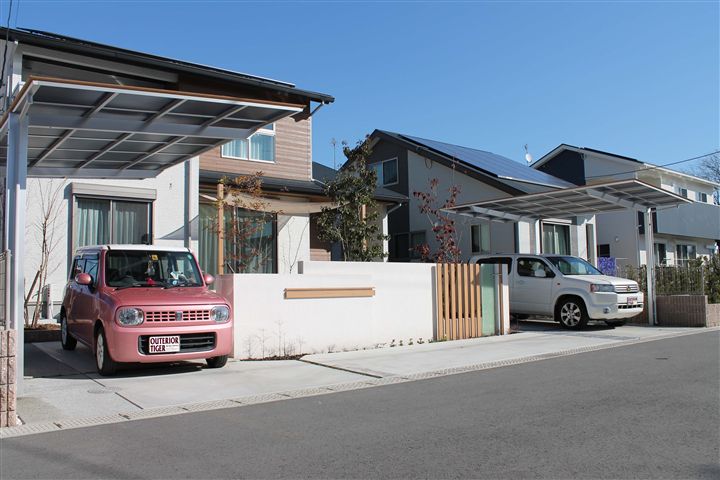 ナチュラルモダンをコンセプトにプランニングしていきました。カーポートの側枠部分や門廻り部分の木目調のアルミ材が、暖かさをだしてくれます。塀の高さや奥行きに変化を造ることで、リズムが生まれます。また表札の背景にある、UROCOが外廻りのスパイスとなり、まとまりの中にバリガラスという異素材が、上手く融合した素敵な現場です。