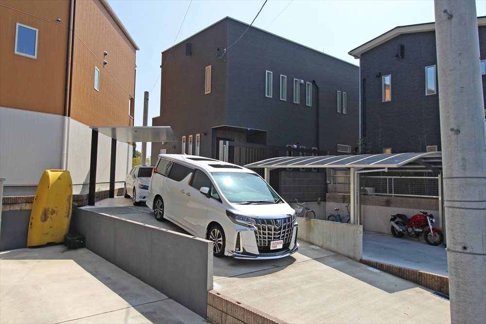玄関前の目隠しを目的とした門柱はタイル貼りのウォールと『LIXIL:Gフレーム』組み合わせ、格子による圧迫感の軽減と大判タイルの重厚感を両立させたデザインをご提案しました。車庫スペースには洗練されたデザインの『LIXIL:カーポートSC』が鎮座し、高級感のあるファサードが完成しました。