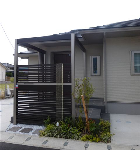 玄関が道路に面しているK様邸。お子様の飛び出しを防止するため、前方に塀を設け、左右から出入りする動線をご提案しました。この塀は玄関前の目隠しの役割も果たしていますが、上部に大きな隙間を設けたり、板の幅を変えるなどの工夫で圧迫感を軽減。また、前方に設けた植栽やインゴットをより引き立てる背景ともなっています。