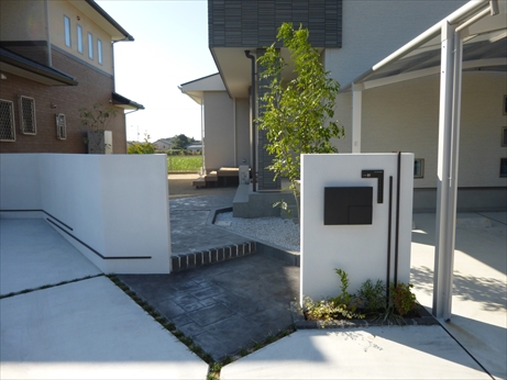 シンプルな門まわりとなりました。また斜めに駐車スペースを取ることで、奥行感が出るだけではなくリビングからの目隠しにもなりデザイン性と実用性が兼ね備えたアウトテリアとなりました。