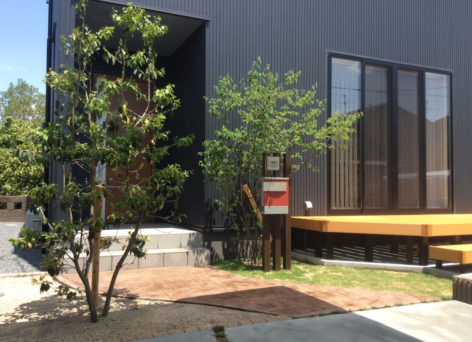 新築外構のご依頼でご要望は「お庭を広くとりたい、道路からの目隠しがほしい、外観イメージを柔らかく見せたい」でした。ポイントとしてはお庭を広く取るために車庫スペースをL字駐車をご提案。目隠しには木調のフェンスをセレクトし樹木を配置しました。木目調の色合いがアクセントとなり柔らかいイメージに仕上げております。デッキから降りたお庭スペースが広く確保できたので大変喜んで頂きました。