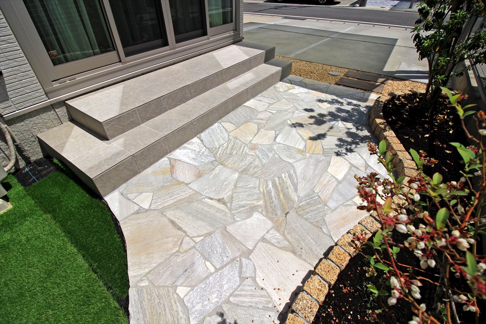 リビング前にポイントを絞ったメンテナンスフリーのお庭です。窓の前にはステップを新設し、お庭への出入りがしやすいデザインを心掛けました。車庫から続く飛び石風の枕木のアプローチ、煌めく自然石。ご自分たちで準備された人工芝の緑が相成って、自然味溢れるナチュラルなお庭が完成しました。