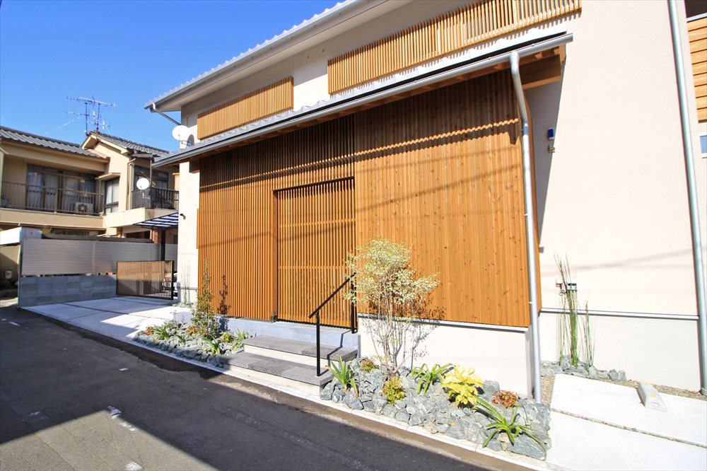 車庫スペースをクローズしたいとのことで、建物のアクセントである木目の縦格子と同じ色合いのオーバードアをご提案しました。電動タイプなので開閉がスムーズに行えます。 玄関前のファサードは敷石の階段をメインに植栽を多く取り入れてナチュラルな雰囲気に仕上げました。