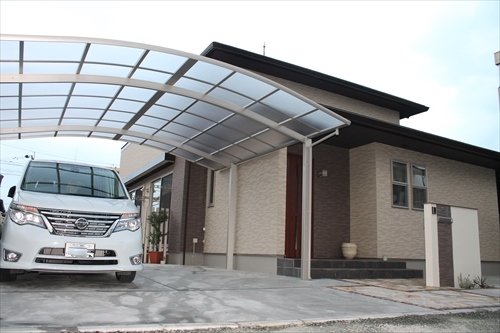 車を3台入れ、使いやすい車庫スペースにしたいとご相談頂きました。全面道路が4M道路なので奥行を長く取り、ゆっくり駐車できる配置にしました。また門柱や駐輪場の配置を車を出し入れする際にに影響のない配置に収め、門柱には建物との一体感がでるように、同じタイルを使用しています。駐輪場には控え壁を設け、道路から直接自転車が見えないよう考え設置しました。