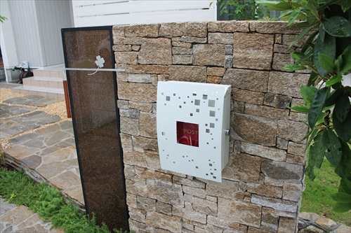 ナチュラルな雰囲気を好まれるお客様に、自然素材を選定し門柱にはEXISLANDウォールストーンを使用しました。大小の織り成す天然石の色合いと凸凹が門廻りの存在感をだしてくれています。またZERO:TWINKLE(ガラスパネル)と自然石の相性が良く、ブラウン色を使用することで、クラッシュガラスに落ち着いた雰囲気を出す事ができました。アプローチには自然石乱形を使用し、全体に馴染む色合いでご提案。季節ごとに楽しめる植栽を配置し、外観も楽しめるエクステリアとなりました。