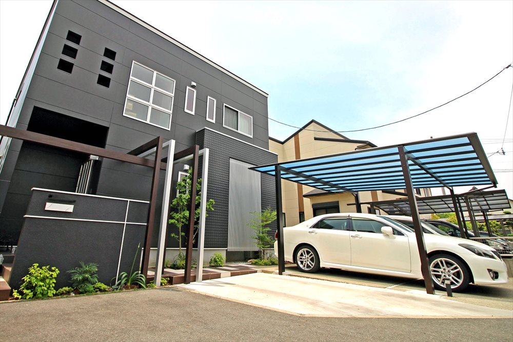 モダンな門柱にフレームを合わせたボリュームのある門廻り。ブラックとホワイトのタイルで彩るアプローチがカーポートへ続き、建物の雰囲気と調和します。ふんだんに取り入れた植栽やガラスマテリアルの煌めきが柔らかで心地良い雰囲気を演出する、シンプルモダンなファサードが完成しました。