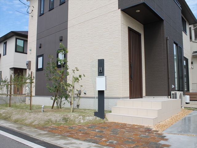 全体的にやさしいナチュラルな外構にしたいとご要望されていましたので、曲線デザインを使い自然な感じをご提案致しました。アプローチのレンガがナチュラルな雰囲気を演出しています。門柱にはお施主様お気に入りの ZERO トミーモードを設置。夜になるとガラス模様が浮き出て、とても魅力的です。ライトアップされた夜の雰囲気を大変ご満足頂けるエクステリアとなりました。