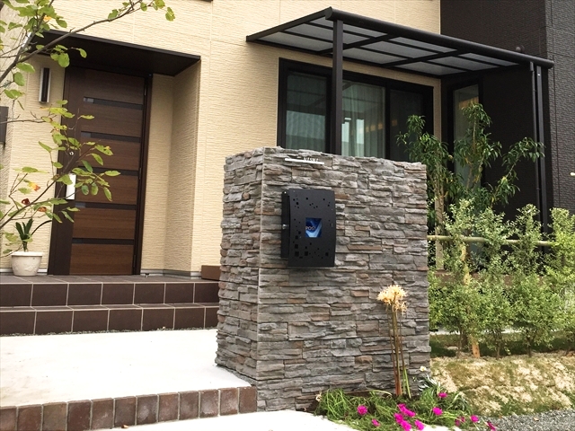 ゲストも含め4台分確保した駐車スペースは、毎日ゆったりと快適に駐車して頂けるよう、一台一台余裕のある寸法にてご提案。門柱は高級感のある LIXIL ラグナロック を使用し、シックに仕上げました。そこに ZERO オリジナルポストffがとても映えます。門柱の質感にお施主様も大満足して頂けました。
