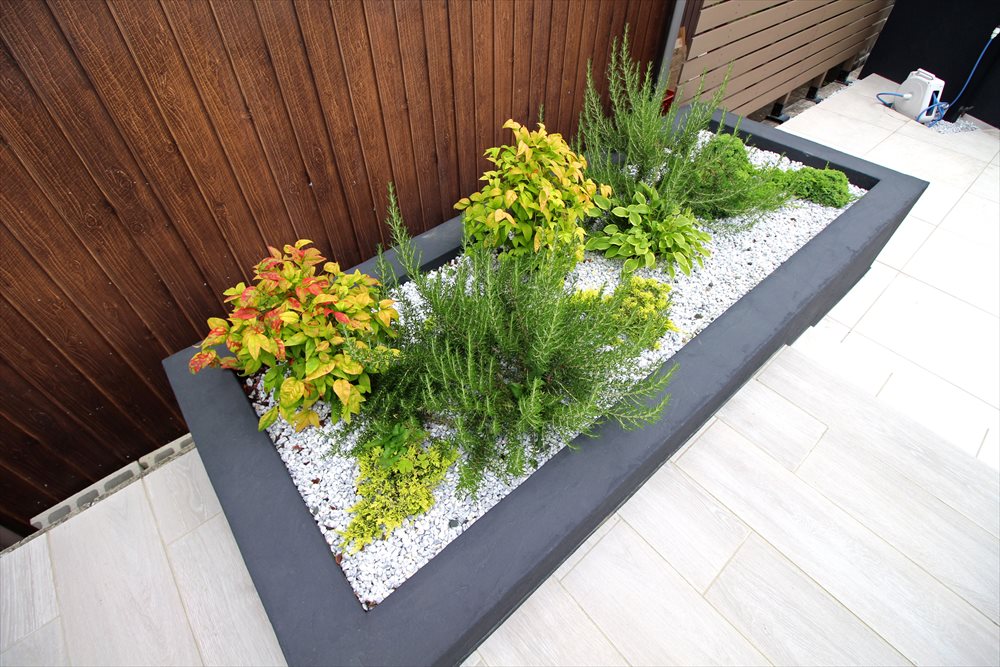 新築時にカーポートのみご準備されていたT様。通りからの目隠しを考慮した、カーポートとのバランスのとれた門廻りをご提案しました。どっしりと立つ格子デザインのゲートは広い敷地のなかで存在感を放ち、2色のウォールと緑豊かな植栽でモダンな雰囲気に。高さを違え、進入口を斜めに振ることで、奥行を感じられるデザインとなっています。