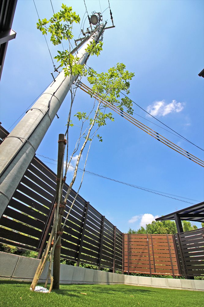 真新しい建物からお庭へと続く人工木デッキ。天然木のような温もりがモダンな建物に調和します。目隠し効果の高いフェンスでお庭を囲ってプライベート空間を重視することで、ご家族がのんびり過ごせる空間となりました。グリーンの人工芝が爽やかで心地よいシンプルなお庭の完成です。