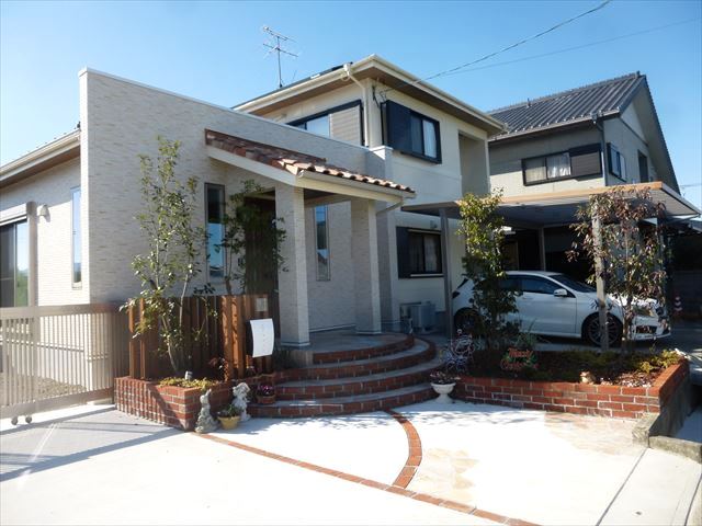 建物の増築に伴い玄関まわりをお洒落にしたいとご相談頂きました。既存住宅とはコンセプトが違い、増築部は南仏の青い空が良く似合うT様邸。雰囲気のある増築部ポーチが印象的です。ポーチ庇の屋根色に合わせて、階段・花壇はレンガを使用し一体感のある門まわりに仕上げました。曲線デザインの階段と樹木での目隠しがやさしい印象になり、より一層建物の雰囲気を引き立ててくれてます。雰囲気の変わった門まわりが完成し、お施主様には大変喜んで頂けました。