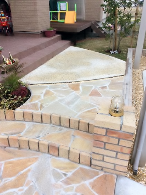 曲線を取り入れたやさしいイメージの外構をご希望されていました。門柱やアプローチ・車庫土間に曲線を取り入れたデザインとなっています。また門柱にはメンテナンスがいらないようタイルを貼り、ガラスの表札やアクセントになっているポストを配置しました。アプローチには不揃いの形が楽しい自然石クォーツストーンを貼り玄関までのアプローチを演出しています。