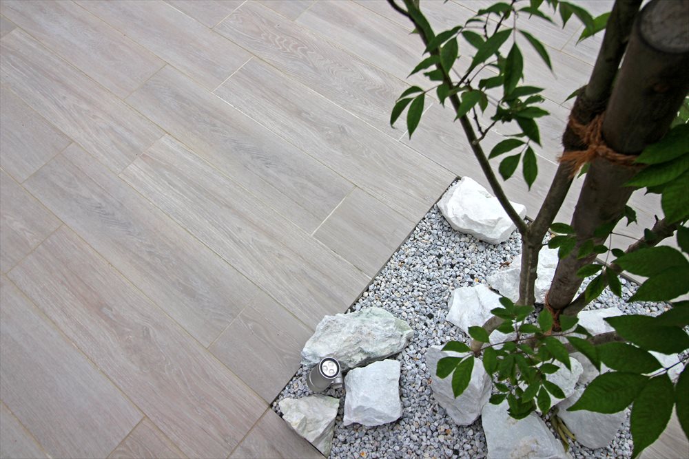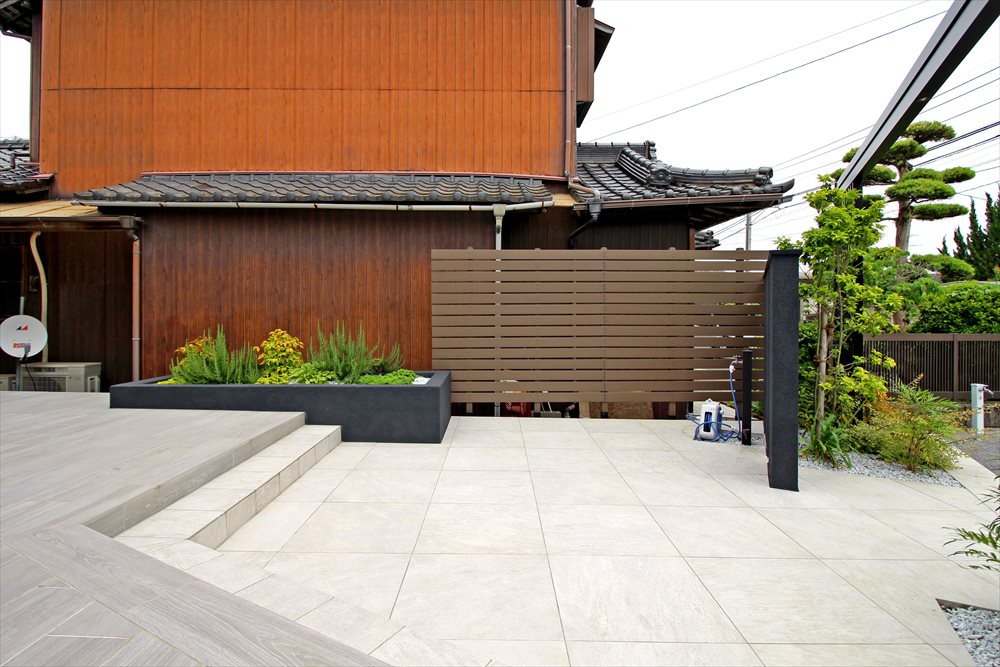 お庭全体をタイル張りとし、大きなテラス屋根をかけました。天然石の表情を湛えたタイルが優美で気品のある空間を演出しています。ご家族で過ごす、清潔感溢れるプライベート空間の完成です。