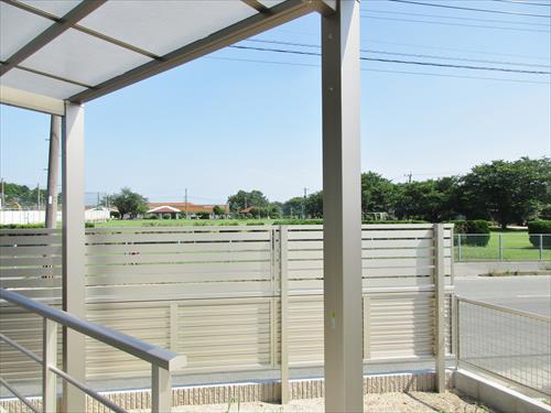 建物との調和のとれた門廻りにするため、木目調の玄関ドアに合わせて人工木フェンスとポールを設置しました。植栽との組み合わせが白い門柱を引き立て、建物を更に良く見せてくれます。車庫スペースは3台分を確保しました。お庭側の道路は交通量が多いので、2段支柱の目隠しフェンスを設置。安心して洗濯物が干せるようになりました。