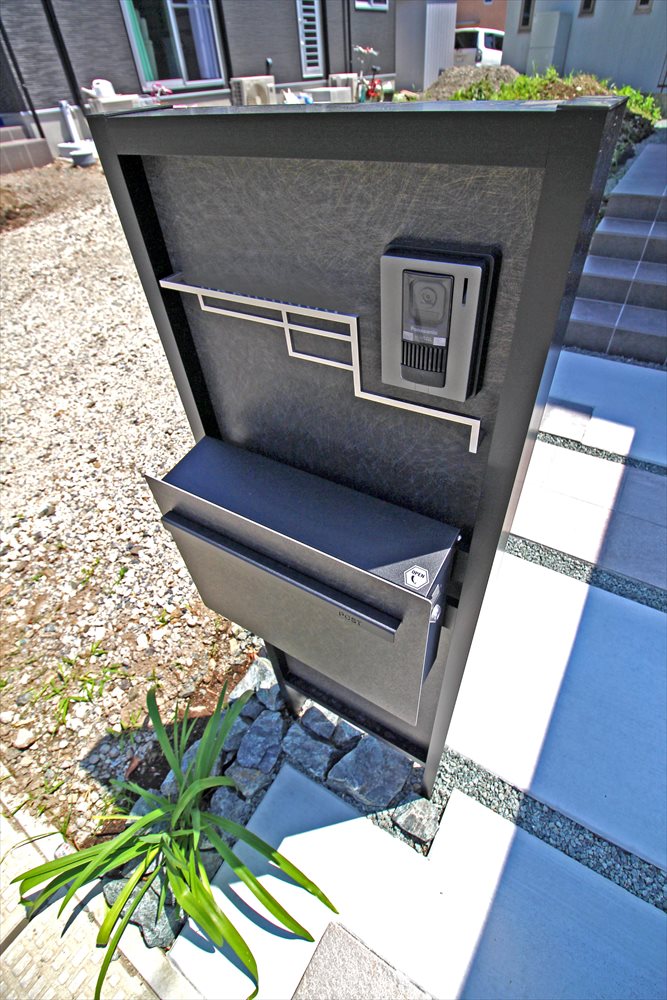 建物の黒い外壁に調和する、シンプルなオープン外構です。シックな機能門柱、3台分のカーポート。製品のカラーをブラックで統一することで外構が全体が引き締まり、落ち着きのある雰囲気を演出しています。単調になりがちな土間コンクリートにはアプローチとなるタイルのアクセントを添えました。