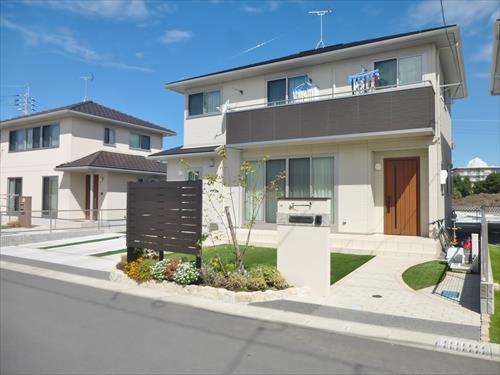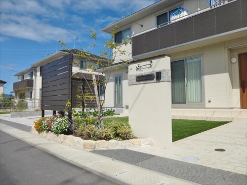 ご主人様が敷き込んだ人工芝の前に真っ白な門柱を構え、土留は自然石で積み上げました。車庫スペースやアプローチの進入口に溶岩石”ボルケーノ”を敷き込み、自然の風合いをプラスしています。目隠しの樹脂製”アーバンフェンス”と植栽が相成って、さらに優しい雰囲気を演出しました。