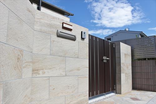 前面道路の車通りが多いため、お子様の安全を考慮して、LIXIL”ワイドシャッターSFタイプ”で車庫をクローズにしました。敷地内で車を横向きに駐車されるので、間口確保と柱が邪魔にならないよう独立シャッターをご希望されました。それに伴い、新たに門廻りもご提案。駐車の妨げにならないよう、門扉を外開きにしています。自然石模様のタイルと木目調の門扉が、すっきりとしたデザインの中にも高級感を醸し出しています。