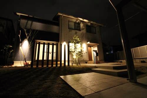 今回スポットライトにLIXIL:美彩を使用しました。灯す優しさ、煌く美しさ、明度などが計算されたハイスペックな暖かい光を植栽に宿します。門柱にはEXLIVE:レイバックにガラスのモニュメントを表札として採用。高透過性を実現したクラッシュガラスが、灯りをその内で乱反射させ、モダンテイストのご自宅に自然に馴染みます。シンプルに癒しを求める、灯りで魅せる門廻りが完成しました。