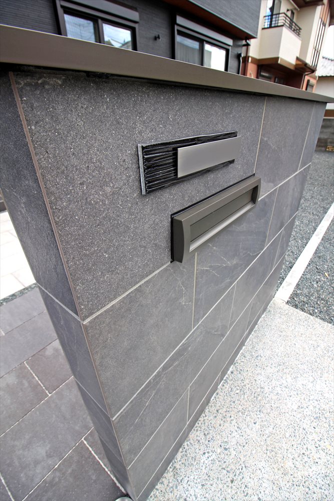 モノトーンの建物にマッチする『LIXIL:カーポートSC』。真新しい建物に寄り添うシンプルな佇まいが目を引きます。車庫スペースを中心としたエクステリアデザインは、シンプルななかに機能性を重視しました。門柱も石目調の大判タイルでシックに仕上げ、ツートンカラーのアプローチと相成って落ち着いた雰囲気が魅力です。