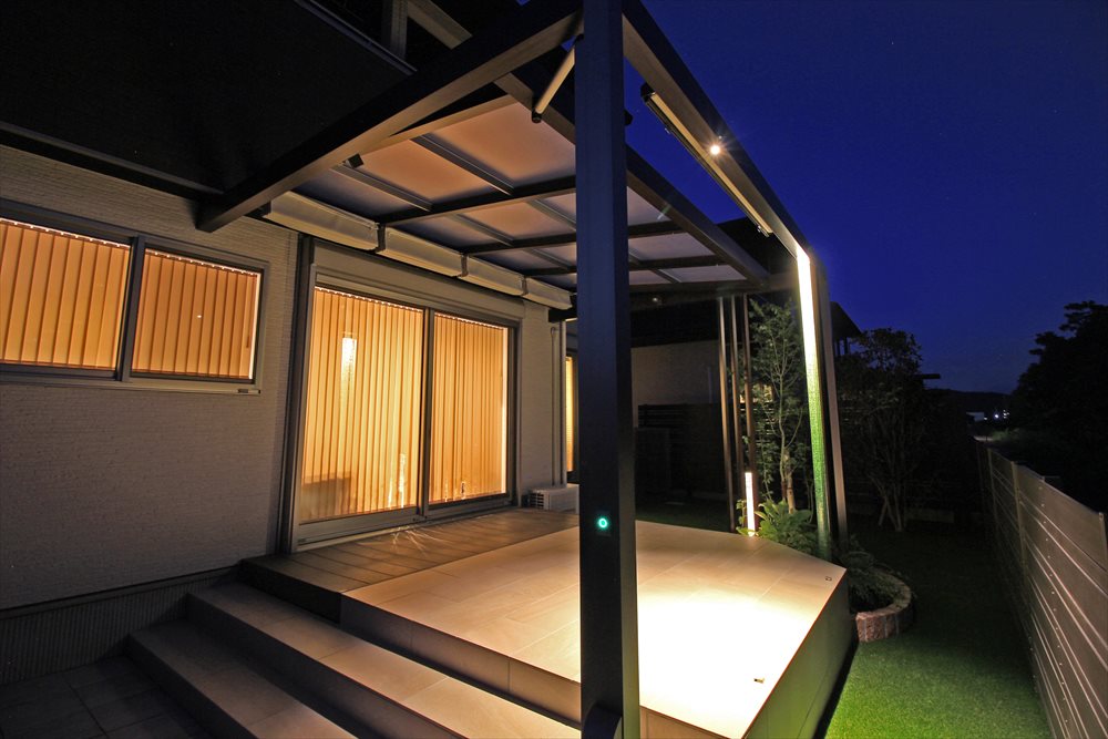 ガラスマテリアルの光を纏うテラスは日暮れと共に輝きが増し、煌めくガラスの競演によってご家族で過ごす夜のひと時をより明るく艶美に演出します。