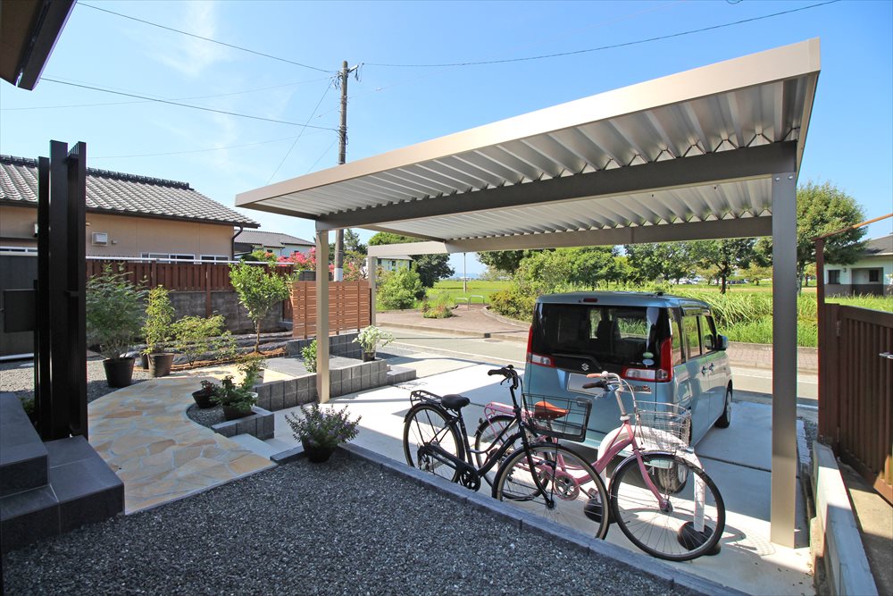 前面道路が広くないため、折半屋根のカーポート『三協アルミ:G1-R』は梁を延長して間口を広げ、駐車のしやすさと玄関への動線を加味しました。玄関前に設けた格子材が道路からの視線を遮りながらも落ち着きのある雰囲気を高めます。