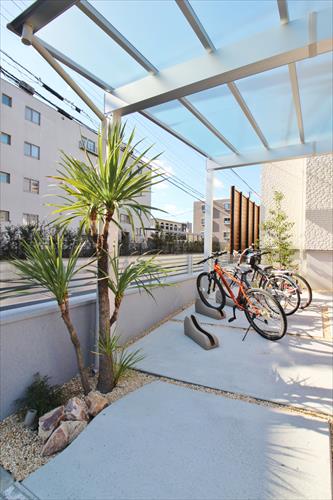 隣地からの視線を遮る玄関横のウォールをキャンパスに見立て、表情豊かな自然石とニオイシュロランで南国の雰囲気をイメージしました。N様が希望された駐輪スペースは3台分のカーポートの下へ収め、アプローチを広く設けることで敷地に更なる広がりが生まれています。要所に配した植栽の緑が真っ白な建物に映え、温もりのある爽やかなエクステリアとなりました。