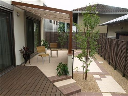 雑草対策に困っていたF様に、タイル貼りとカラー砂利を組み合せお勧めしました。リビング前のテラス空間は、お隣の2Fからの目隠しも兼ねてすりガラス調のポリカーボネート板が貼ってあります。人も目線を気にせず快適に過ごせているようです。