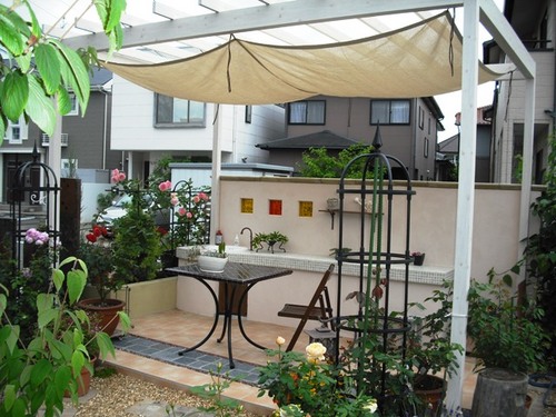 もともとあった流し台をリフォームしたいとのご依頼だったので『やすらぎのあるお庭』をご提案しました。K様の大好きなバラや緑に囲まれた空間ができそこで過ごす時間にとても満足して喜んで頂けました。