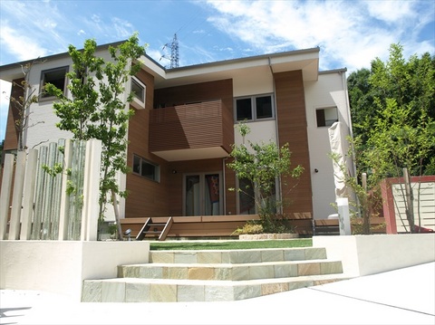 お子様が走りまわれるお庭にしたいとご相談を頂きました。広い敷地内は段差がありお子さんが走りまわるには足元が不安定でしたので、人工芝をご提案。アプローチには自然石を貼りお手入れもいらないお庭ができ大変喜んで頂きました。和室前のお庭や玄関から見える空間には、ガラスパネルやガラス柱を取り入れモダンなお庭に仕上げています。