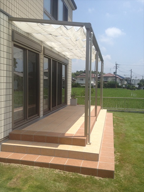 リビング前にテラス屋根とタイルテラスを設置しました。