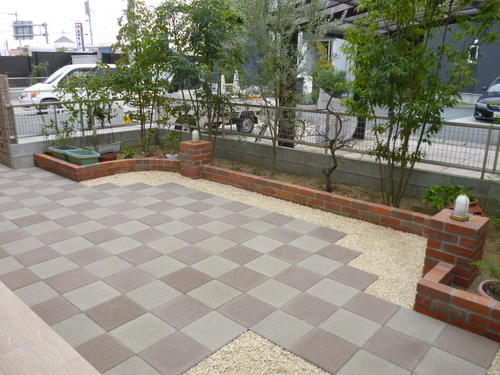 「雑草対策」からスタートしたガーデンリフォーム。色々ご要望をお聞きすると、お部屋からスムーズにお庭にでるステップが欲しい・・・植えてある樹木との境が欲しい・・などのご要望がありました。まずステップには木目調タイルでどの部屋からも降りられるステップをご提案し、床材には透水性のあるコンクリート平板を敷きつめました。最後に緑が引き立つようレンガで縁取りをし、バランスよくまとめました。ノーメンテナンスで昼も夜も楽しめるお庭になったと喜んで頂きました。