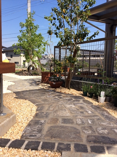 新築工事に伴いガーデン工事をご提案。まず建物側にはゆっくり過ごせる空間と毎日ご利用頂くお洗濯もの干場の空間を明確に配置しました。お洗濯物干場にはガーデンルームを設置。天候に左右されずご利用頂けるので、奥様大満足です。リビングダイニング前にはテラススペースを設け休日ご友人・ご家族でゆっくり寛げるスペースに仕上げました。ご主人様こだわりのウッドデッキはジャラ材を使用。天然木の美しさと耐久性と兼ね備えた木材で大変ご満足頂く事ができました。