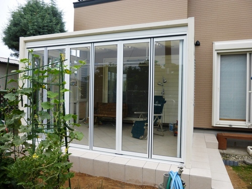 お庭の有効活用を目的に、三協立山アルミ『ハピーナ』を取付ました。玄関側からの目隠しを兼ねて、側面は腰パネルを採用!!白を基調とした明るいガーデンルームです。側面には可動式の換気パネルも取付ましたので、扉を閉めたままでも、バッチリ換気ができます!!