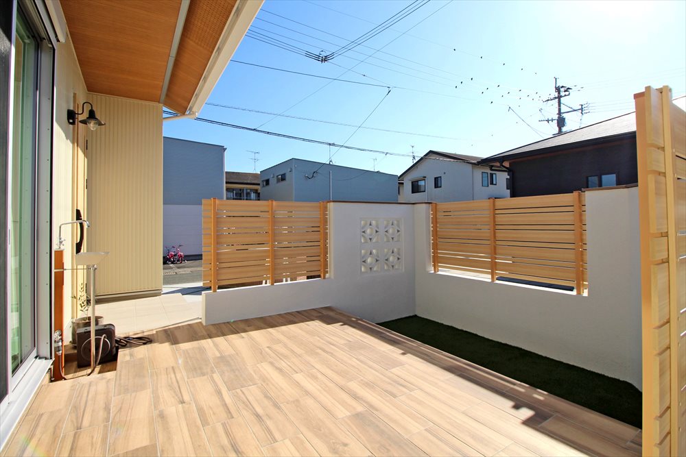 既存の門柱に合わせて、木調タイルや樹脂フェンスなど、 明るい木調のぬくもりに包まれたプライベートガーデンをご提案しました。高さのあるウォールでしっかり囲んでいるので、外からの視線を気にせず、ゆっくりお過ごし頂けます。透け感のあるスクリーンブロックで圧迫感を軽減しています。