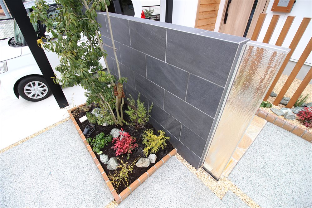 重厚感のある門柱はダークカラーの大判タイルで存在感を放ち、寄り添うガラスマテリアルが美しく煌めきます。どっしりと構えるカーポートは『U.スタイル アゼスト』をセレクトし、建物の形状に合わせて段違いの屋根を施工しました。要所に配した植栽でナチュラルな雰囲気をプラス。春に芽吹く緑が楽しみです。