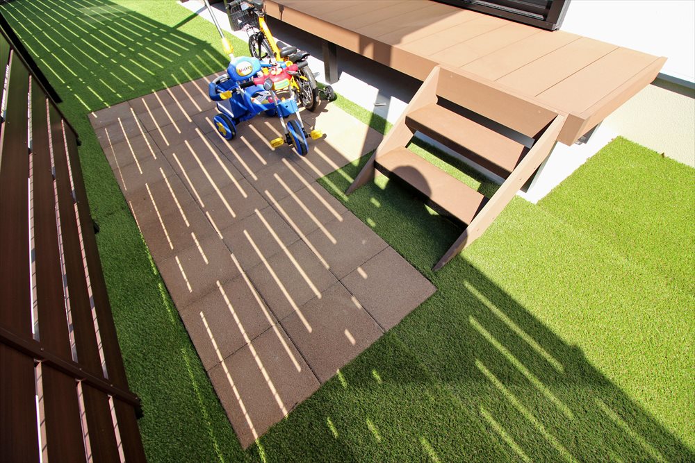 山砂のお庭をご家族で楽しめるお庭へ。ウッドデッキとガーデンフロアはバランスにこだわり、奥行きが限られたお庭を有効的に使えるデザインとなっています。お庭一面に施工した柔らかな人工芝はお子様が転倒しても安心で、目隠しフェンスでしっかりをプライバシーを確保しているため周囲の視線を気にせず存分に遊んで頂けます。