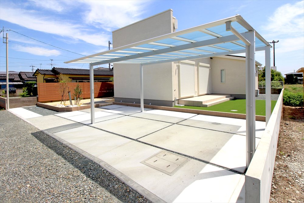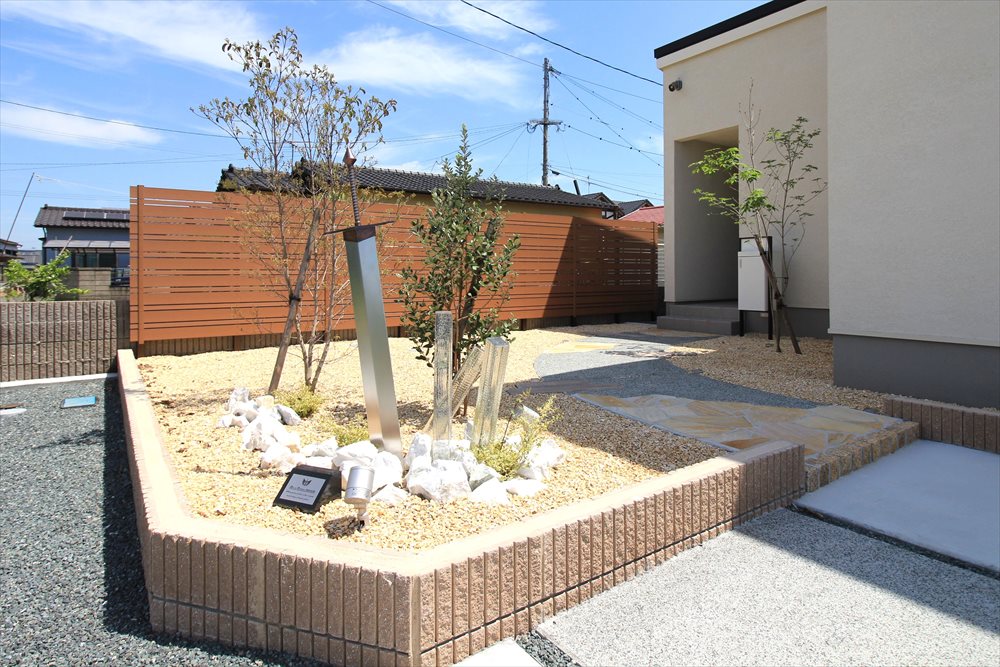 施主様がご準備された表札をメインに、植栽をふんだんに使用したナチュラルな外構をご提案しました。ゲームがお好きな施主様が選ばれた聖剣をモチーフにした表札には、ガラスマテリアル『インゴット』でファンタジーな風合いをプラス。遊び心溢れるファサードが完成しました。