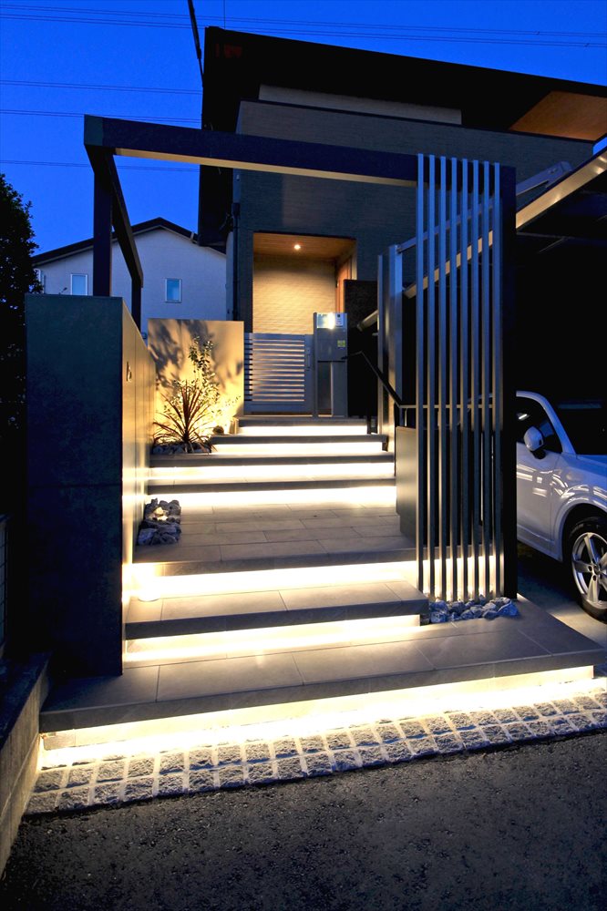 高低差のある敷地を浮き階段でゆったりと繋いだファサード。夜には幾重にも続く光の層が、圧倒的な存在感を放ちます。