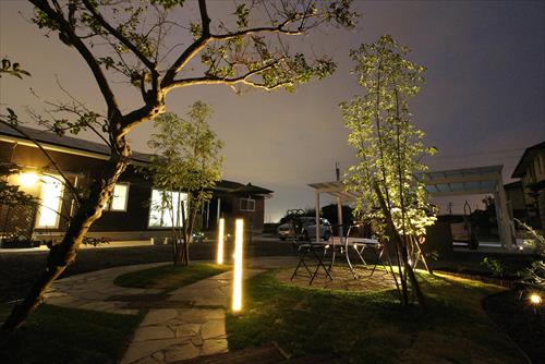 以前車庫工事をお世話になったS様。広いお庭のお手入れを楽にしたいと言う事で、カフェのようなお庭造りを希望されました。法芝とそれを回遊する石貼りの小道がポイントで、要所に植えた樹木をゆっくり眺められる設計となっています。夜のライティングでは高級感が更に高まり、自然味溢れる癒しの空間となりました。