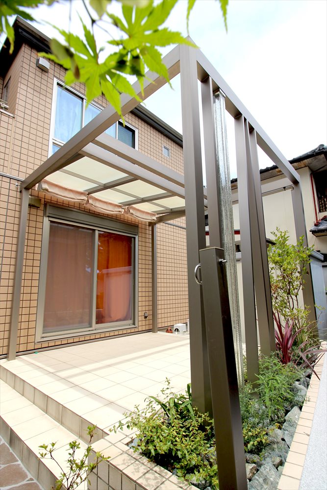 樹木が生い茂ったお庭を再び活用するため、お手入れの要らない“見て楽しめる”お庭へとリフォームを行いました。お庭を占領していた樹木を整理し、テラス屋根の先には新たに設けたデザイン格子とガラスマテリアルで遊び心をプラス。落ち着きのある和の空間で癒しの時間を演出しました。