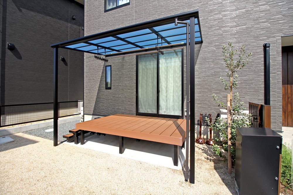 リビング前に設置した人工木デッキとテラス屋根。ブラックのすっきりとしたカッコイイ佇まいが建物に調和し、”暮らしやすさ”をお手伝いします。玄関脇に位置するため、アイストップとなるアクセントウォールをご提案しました。アイアンのお洒落なデザインが空間を華やかに彩ります。