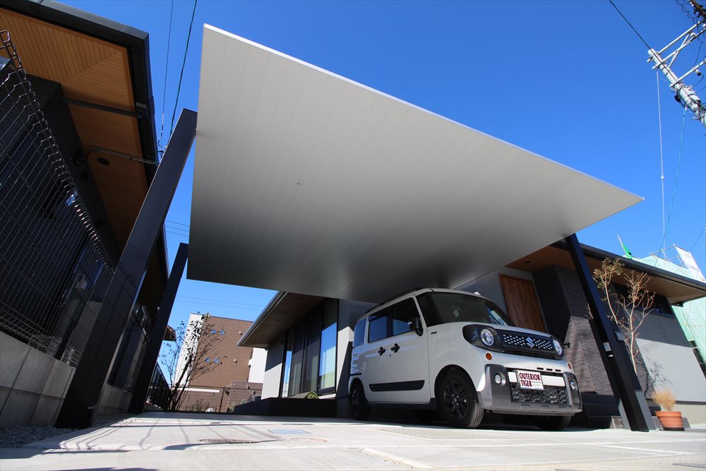 真新しい建物にフィットする、車庫工事をお世話になりました。建物を引き立てるのはすっきりとしたデザインが魅力の『LIXIL:カーポートSC』。暮らしに寄り添いながら、ファサードを華やかに演出します。