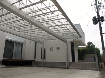 スタイリッシュで独創性のあるカーポート『Mシェード』は建物前の車庫スペースを覆う事で雨の日でもゆっくりと車から出入りができる実用性の高いカーポートです。梁が10Mまで対応できるのでお客様のご要望に合わせたサイズが選べる事もMシェードを選ばれた理由の一つのようです。
