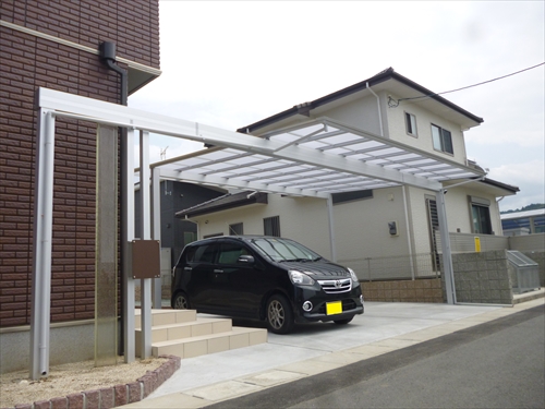 2台用のカーポートとカッコイイ門まわりにしたいとのご要望で、統一感が出るよう梁延長タイプのカーポートセレクトし、カーポートの梁にはインゴット(ガラス柱)を取り入れた門まわりをご提案しました。インゴットには文字を入れサインの役割もはたしています。夜にはダウンライトがインゴットを照らし、存在感のあるカッコイイエクステリアとなりました。