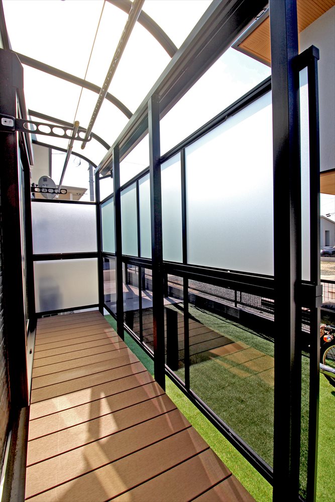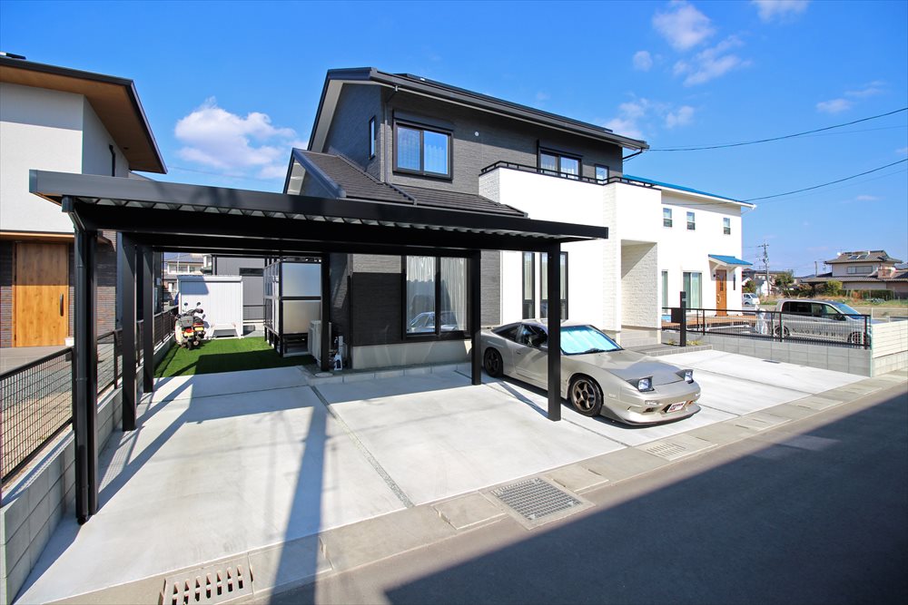 真新しい建物に施工したカーポート『YKK:ジーポートPro』。屋根の一部をカットすることで建物にフィットさせ、どっしり構える折半屋根でお車をしっかり守ります。玄関前にはシンプルな門柱、お庭には既存のデッキにテラス屋根を設置。側面パネルによる目隠しで、リビング前のプライベート感を重視しました。施主様が敷いた人工芝が心地よい彩りを添えます。
