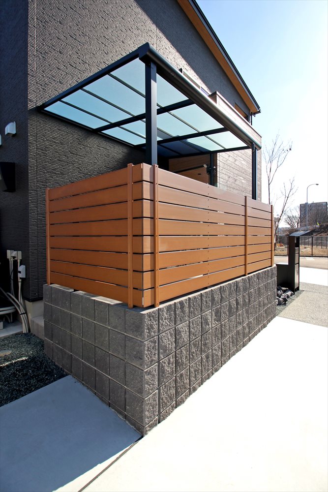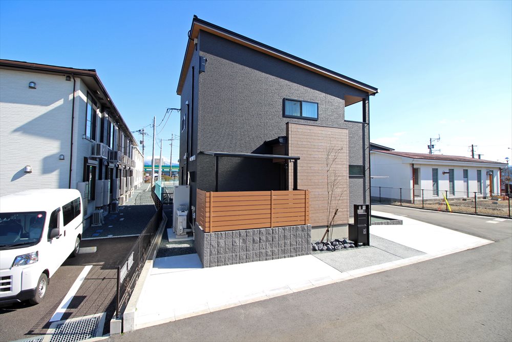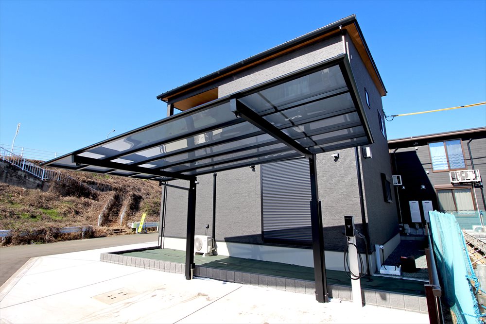 宅配ボックスを備えた機能門柱。電気自動車の充電設備を完備した駐車スペース。汚れた作業着を帰宅時にすぐお洗濯できるよう、玄関脇に設けたランドリースペース。必要なモノだけを備えたシンプルな佇まいが魅力の、施主様の暮らしに寄り添うエクステリアです。