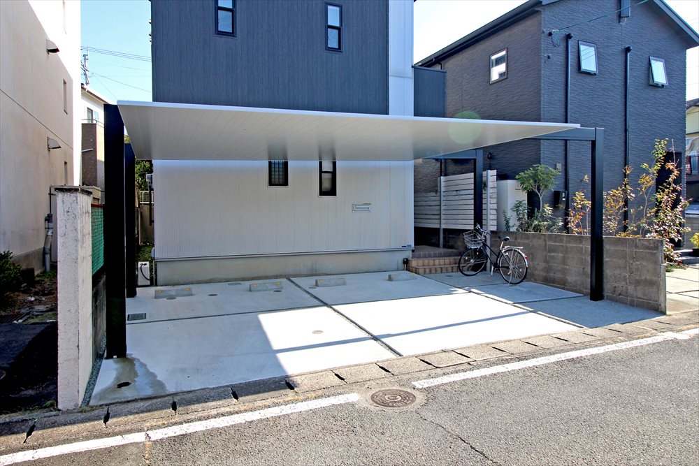 芝や枕木などでナチュラルな風合いだった車庫スペースを、メンテナンスフリーのコンクリートへ。新設したカーポートは『LIXIL:カーポートSC』を選ばれました。梁を延長することで駐車スペースとアプローチに一体感が生まれ、スタイリッシュな佇まいが建物と調和します。