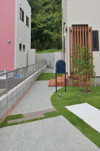 駐車スペース4台分をご希望のM様。ご予算の都合もありタイヤが乗る部分だけをコンクリートにしたプランをご提案しましたが、ご主人様が植えられた芝のなかに縦縞のアクセントとなり、シンプルな建物を引き立てる可愛いデザインとなりました。道路からの目隠しを兼ねた門廻りは木調をベースとしていて、自然味溢れる優しいエクステリアの完成です。
